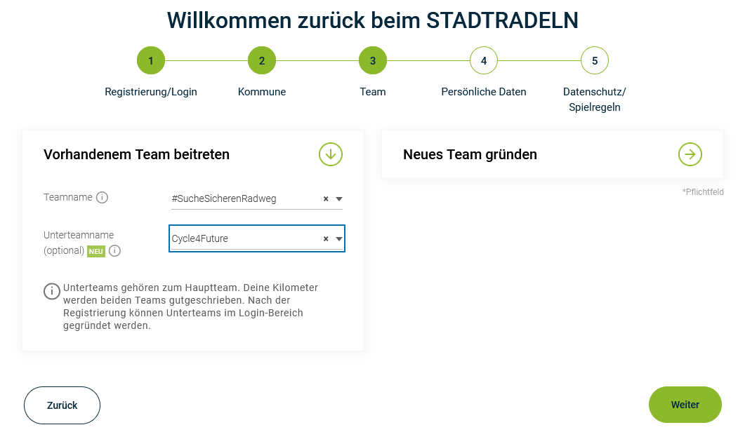 Bei der Anmeldung bei Teamname #SucheSicherenRadweg auswählen und bei Unterteamname Cycle4Future auswählen